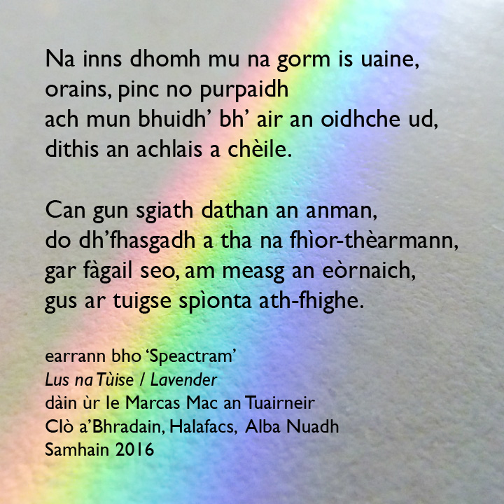 Bradan Press brings you this poem preview from Lus na Tùise / Lavender, a volume of new Scottish Gaelic poems by Marcas Mac an Tuairneir coming out in November 2016.