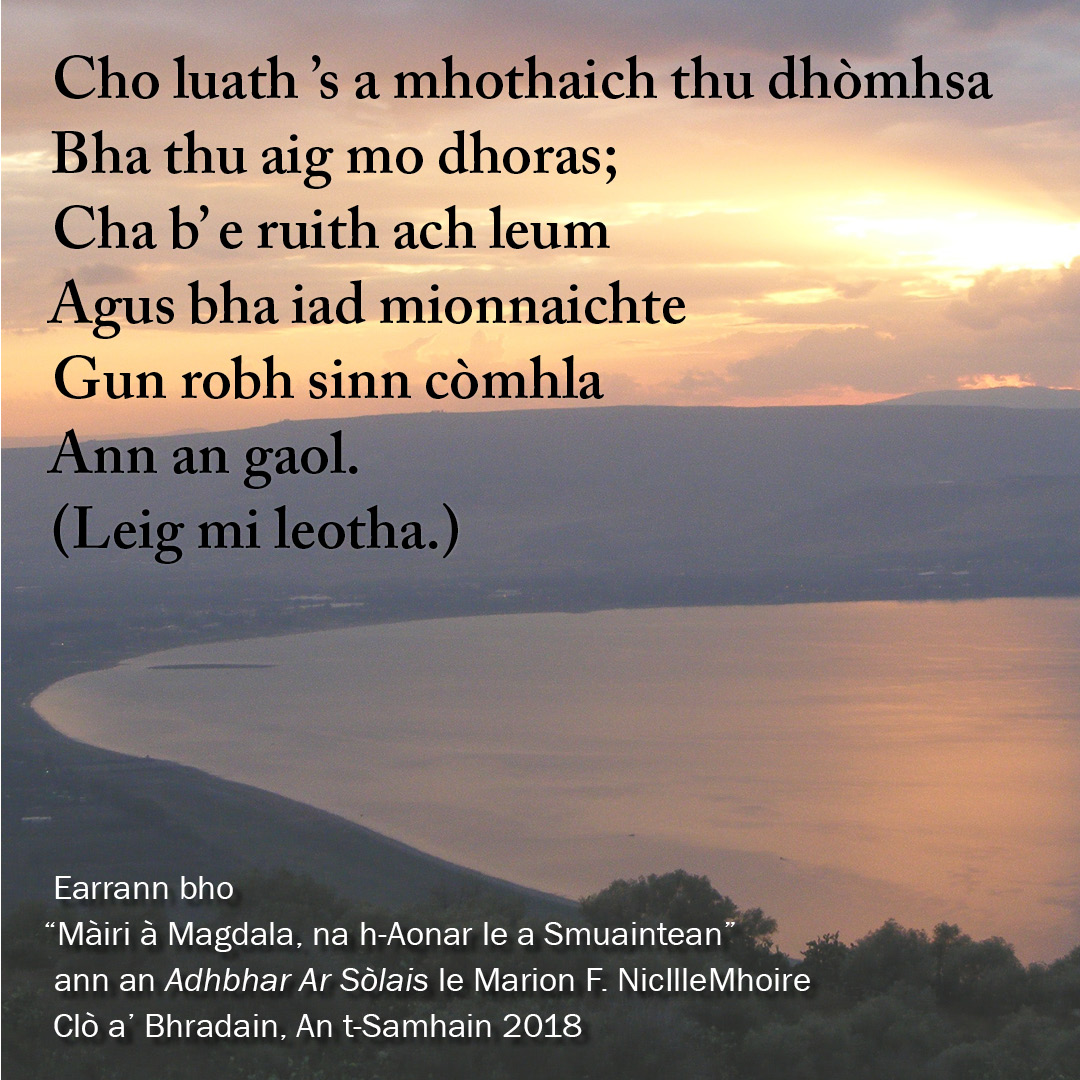 A poem excerpt from the new collection Adhbhar Ar Sòlais / Cause of Our Joy by Marion F. NicIlleMhoire, to be published by Bradan Press in November 2018: