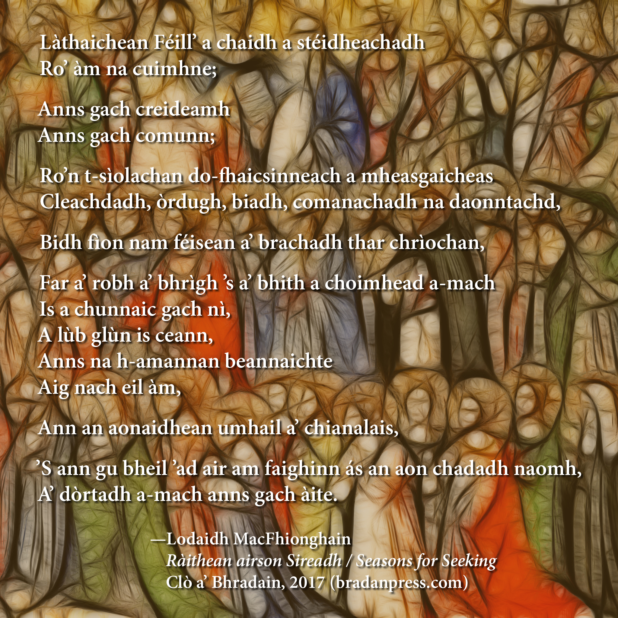 —Lodaidh MacFhionghain, Ràithean airson Sireadh (Clò a’Bhradain, 2017)